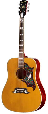 The 1960 Hummingbird features all of the ornamentation that makes the vintage originals instantly recognizable. The body features multi-ply top and back binding. The belly up rosewood bridge plate is equipped with a compensated bone saddle, and the nut and bridge pins are also bone. The pickguard features the legendary Hummingbird shape and engraved artwork design. On the headstock, gold-plated Epiphone Deluxe tuners with green Keystone buttons help ensure solid tuning stability so you can spend more time playing and less time looking at an electronic tuner. The headstock features a two-ply black and white truss rod cover, and the Epiphone logo and Gibson Crown are inlaid in aged mother-of-pearl. The headstock features a Gibson-style "open book" profile with the Inspired by Gibson Custom double diamond logo etched on the rear.