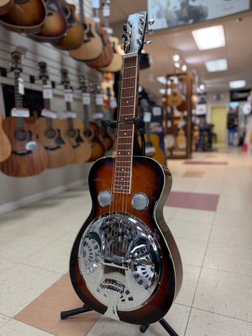 The Paul Beard Signature features a laminated mahogany body and top, and a mahogany neck, all finished in a beautiful tobacco sunburst. The fingerboard features simple dot inlays and, like the body, cream-colored binding. The resonator features the famous Paul Beard "open" soundwell, resonator cone, and spider bridge. This combination produces the characteristic warm tone perfect for country blues and fingerstyle solos.