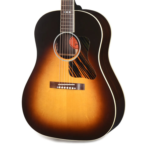 The Gibson Advanced Jumbo Original is arguably Gibson's best sounding acoustic guitar! With sound and style straight out of 1936 this beast sounds huge elevating Gibson’s classic long-scale canon with stage-ready LR Baggs VTC electronics. Combining a long, 25.5-inch scale length (as opposed to Gibson’s standard 24.75 inches) with a Sitka spruce top, traditionally scalloped wide X-bracing, and rosewood back and sides, the Advanced Jumbo Original delivers a booming bass response and mammoth projection that’s sure to thrill bluegrass flatpickers and strummers. Next, is the Advanced Jumbo Original’s comfortable mahogany neck. The neck is fit with a traditional compound dovetail joint with hot hide glue, topped with a beautifully bound rosewood fingerboard that displays dazzling diamond and arrow mother-of-pearl inlays. You also get a charming collection of period-inspired appointments, including a vintage-style square bridge, a fire stripe pickguard, and the iconic Gibson script logo on the headstock. Sealed with a nitrocellulose lacquer finish, the Gibson Acoustic Advanced Jumbo Original will only sound and look better the more you play it — just like a true vintage golden-era Gibson.