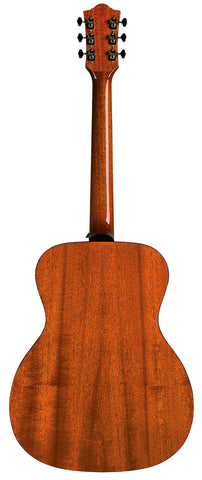 This mid-sized orchestra shaped acoustic is equally suited for strumming and fingerpicking, and produces a sweet, balanced tone. The perfect choice for the versatile musician, the OM-120 features a solid African mahogany top and solid African mahogany back and sides. Other premium features include a bone nut and saddle and mother-of-pearl rosette. This model also has a 1¾” nut width on a vintage shaped Guild neck, iconic Chesterfield headstock emblem reminiscent of 1960s Guilds, period-correct tortoiseshell pickguard, and Guild’s new premium acoustic gig bag. Available in Natural gloss finish.